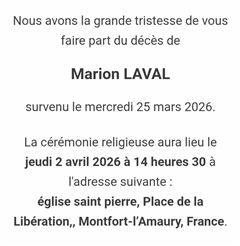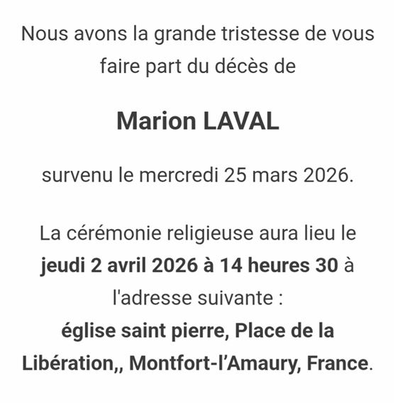 Ses obsèques auront lieu le jeudi 2 avril 2026 à 14 h30 à l'église de Montfort l'Amaury.